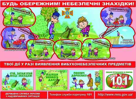 Протипіхотні та протитанкові міни, гранати та розтяжки — лише невелика частина неприємних сюрпризів, які залишає по собі війна, та які вкрай важливо уміти розпізнавати. Ці смертоносні предмети дуже різні і можуть знаходитись у найнеочікуваніших місцях, але правила поведінки з ними завжди однакові: не підходь, не чіпай, телефонуй 101.